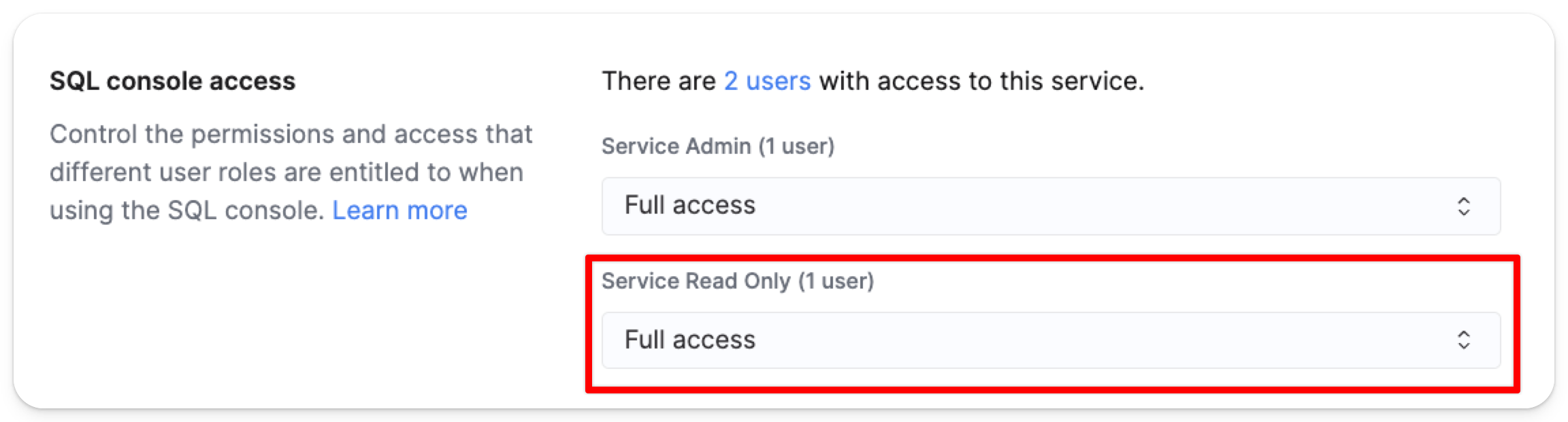 Выберите раскрывающееся меню для Service Read Only, чтобы изменить настройки контроля доступа для ролей Service Read Only: